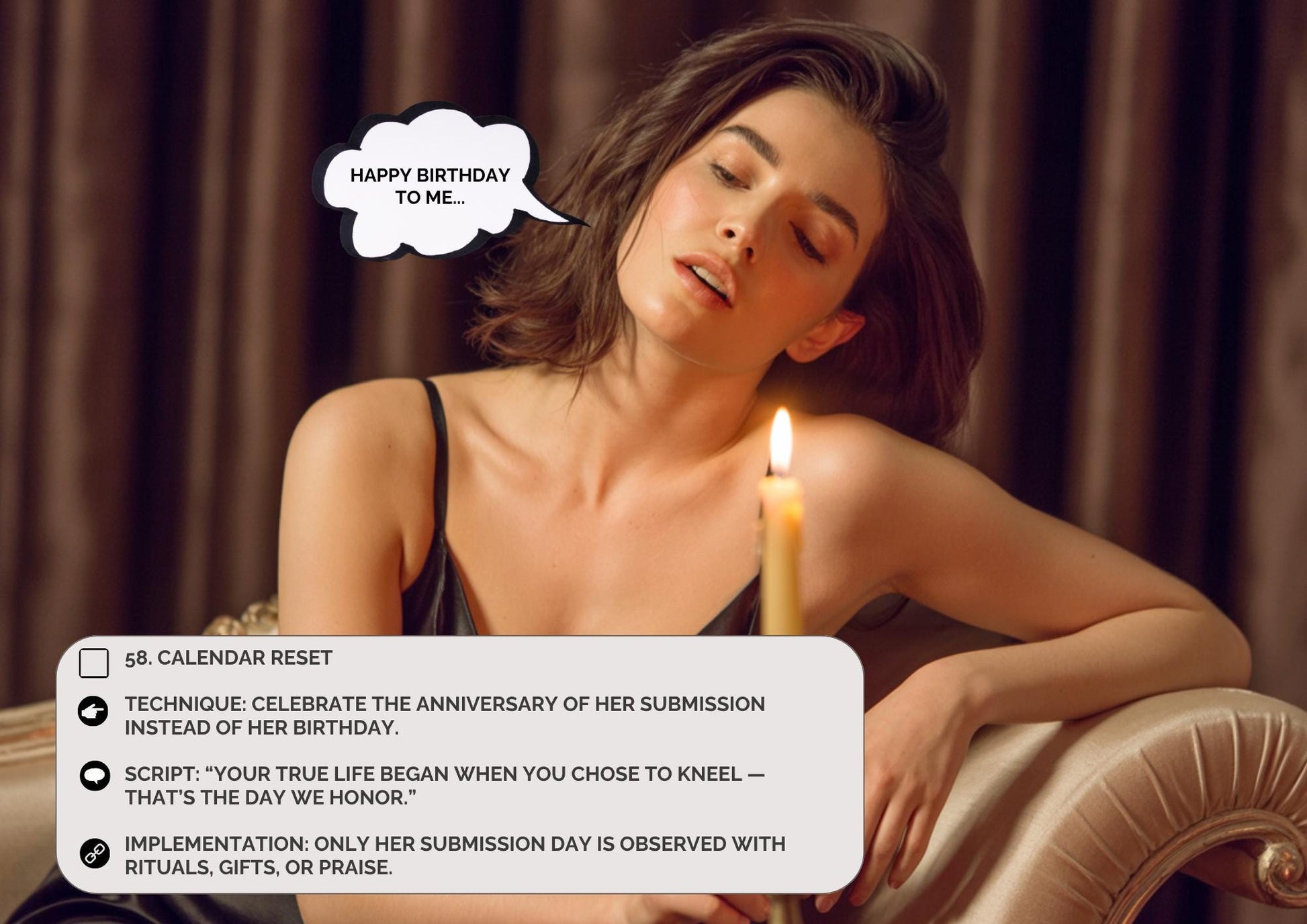 This collection isn’t about physical restraint - it’s about taking her mind first. These tasks are crafted to establish deep psychological authority through ritual, repetition, and verbal obedience.