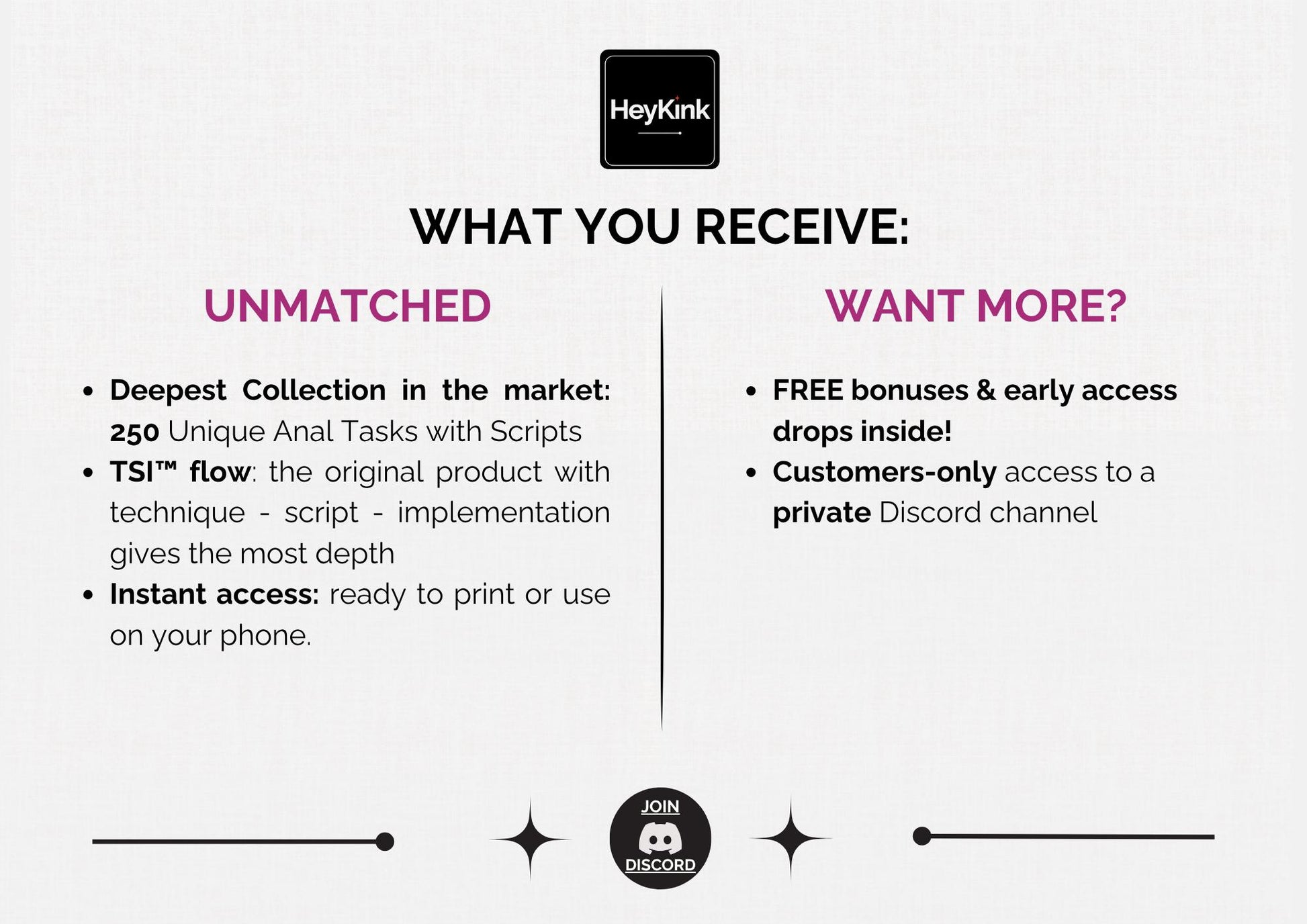 When you purchase, you’ll receive an invitation to the private HeyKink Discord server - a community space featuring: