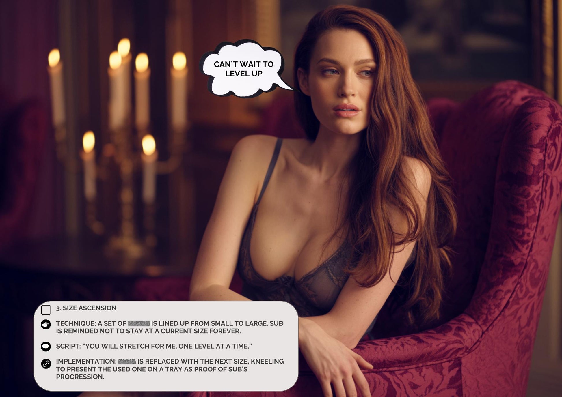 All tasks are for consenting adults (18+) only. Use safewords, discuss boundaries, and provide aftercare. This material is for erotic roleplay and structured BDSM training - never a substitute for negotiated consent.