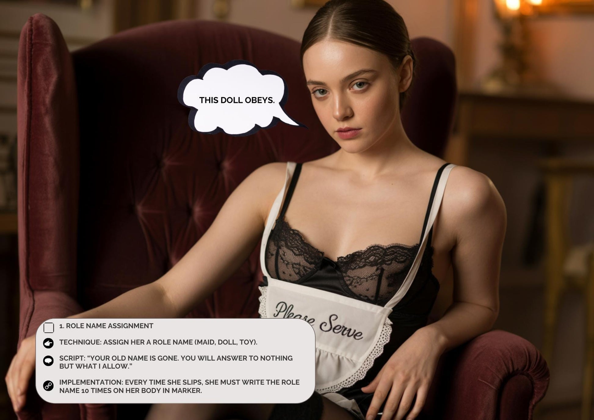 • 3 themed service rituals tied to posture, clothing, and degrading chores
