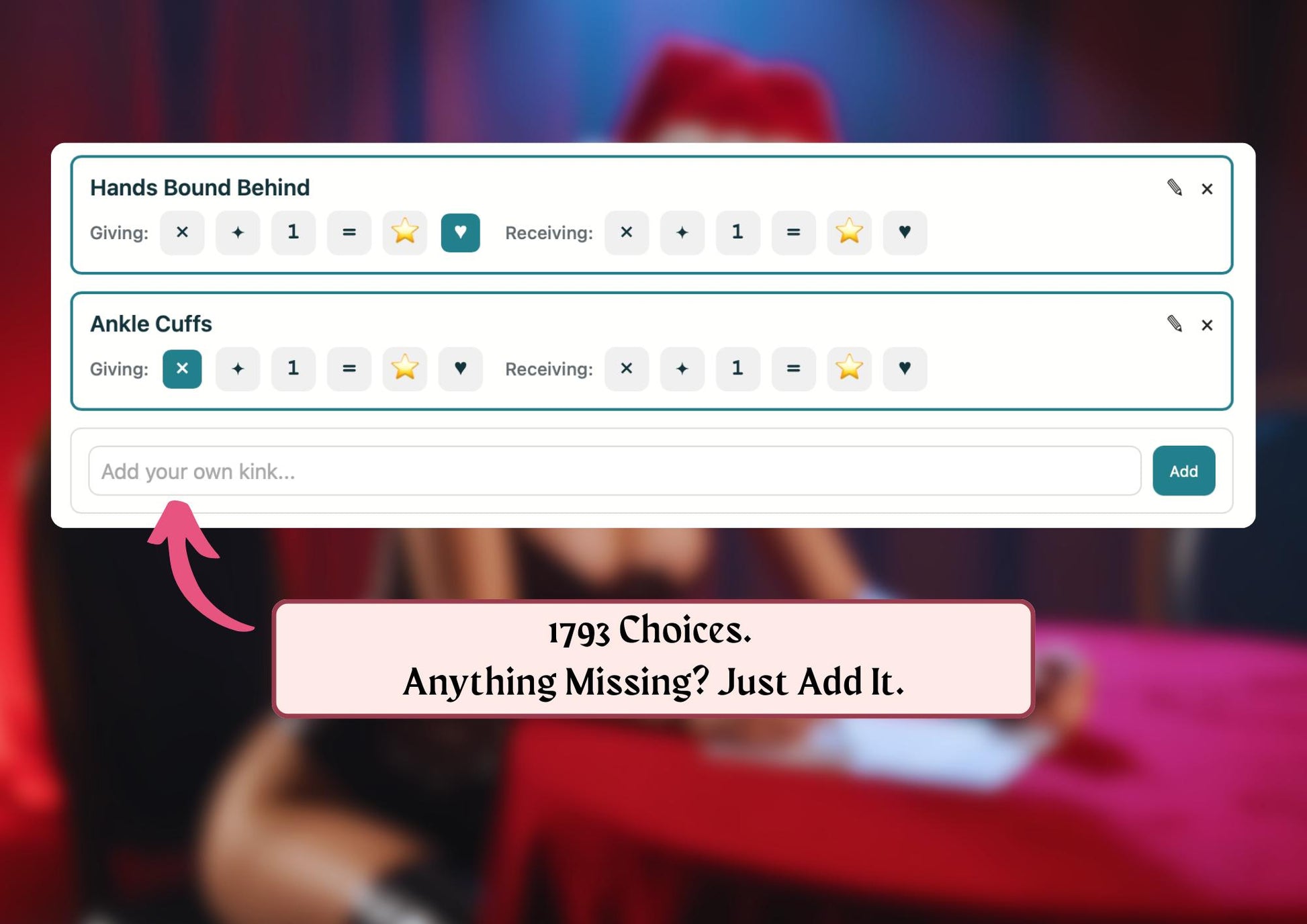 ✍️ Add Your Own Kinks: Not limited to our 1793? Build your personalized list by adding custom kinks that match your unique desires.