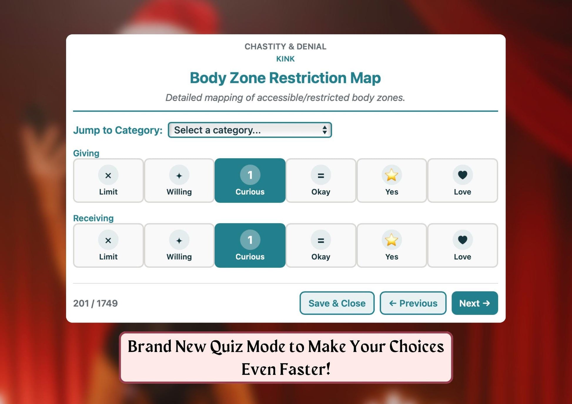 ⚡ New Quiz Mode: Power through your preferences faster than ever. Rate items as Limit, Willing, Curious, Okay, Yes, or Love. Jump between categories instantly. Build your profile in minutes, not hours.