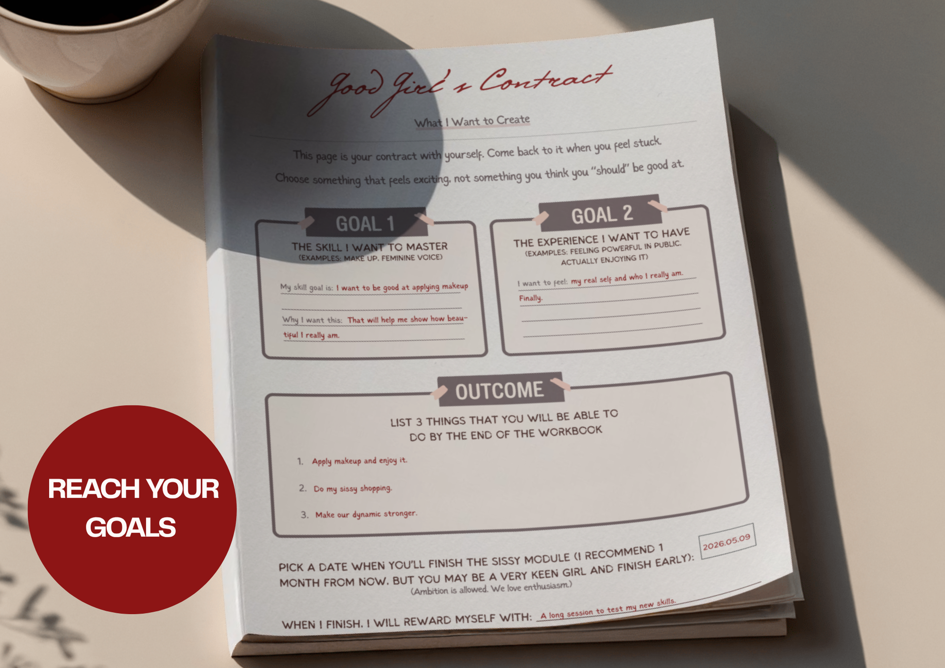 A guided sissy transformation workbook for beginners who want to feel genuinely feminine and confident. It combines practical shopping lists, grooming routines, voice training, and skill practice so you're not just fantasizing - you're building a sissy identity one pretty detail at a time. From curious to unapologetically girly, one practice page at a time.